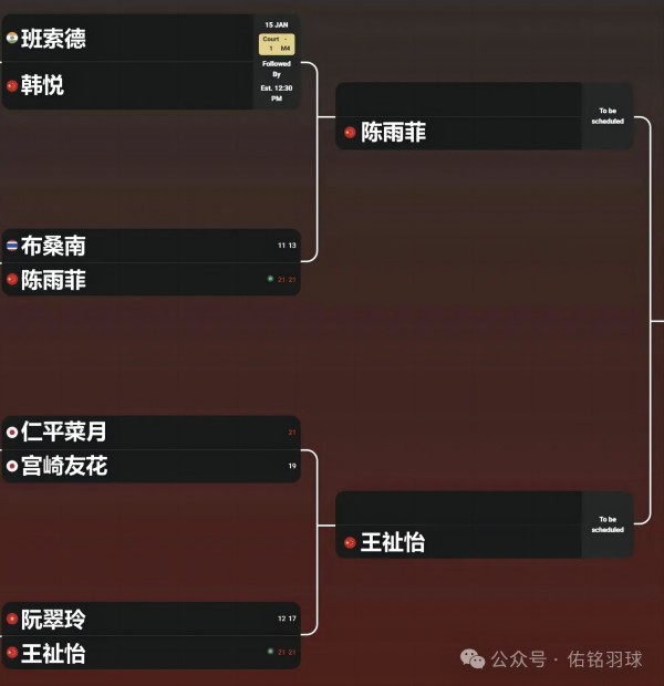 下半局,布桑南出界球有些多,陳雨菲大范圍調動,進一步把比分擴大至16-8領先,在連送兩個出界和一個邊線判斷失誤之后,雙方打出多拍,陳雨菲一個劈吊得分。雙方你來我往,斗智斗勇,但分差有些大,盡管布桑南偶爾打出一些假動作變化,得分很漂亮,但還是杯水車薪,陳雨菲21-13再勝一局,晉級8強。